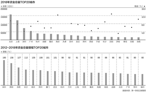 第一財經(jīng)記者梳理了40個主要城市2018年底的資金總量,目前京滬的資金總量仍遙遙領(lǐng)先;增速方面,2012~2018年,深圳、貴陽、合肥、長沙、南京的資金總量增幅位居前五,制造業(yè)大市、東北、華北的不少城市增幅都較低。