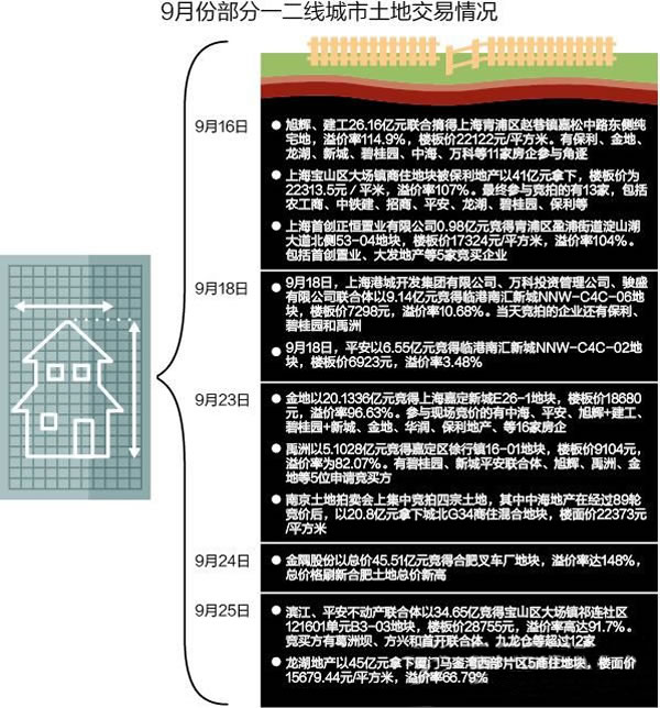 同樣的情況也發(fā)生在其他城市。9月23日,南京土地拍賣(mài)會(huì)上集中競(jìng)拍四宗土地,其中中海地產(chǎn)在經(jīng)過(guò)89輪競(jìng)價(jià)后,以20.8億元拿下城北G34商住混合地塊,樓面價(jià)22373元/平方米,創(chuàng)造了南京的樓面價(jià)新高。9 月24日,金隅股份以總價(jià)45.51億元競(jìng)得合肥叉車廠地塊,溢價(jià)率達(dá)148%,總價(jià)格創(chuàng)下合肥土地總價(jià)新高。在廈門(mén),9月25日一向行事穩(wěn)健的龍湖地產(chǎn)以45億元拿下廈門(mén)馬鑾灣西部片區(qū)5商住地塊,樓面價(jià)15679.44元/平方米,溢價(jià)率66.79%,無(wú)論是總價(jià)還是樓面價(jià)格都創(chuàng)造了廈門(mén)當(dāng)?shù)氐男赂摺?/FONT>
