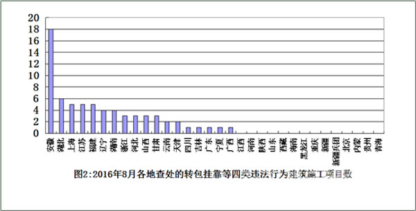 從查處的轉(zhuǎn)包、掛靠等四類違法行為看,安徽、湖北省查處項(xiàng)目相對(duì)較多(見圖2)。